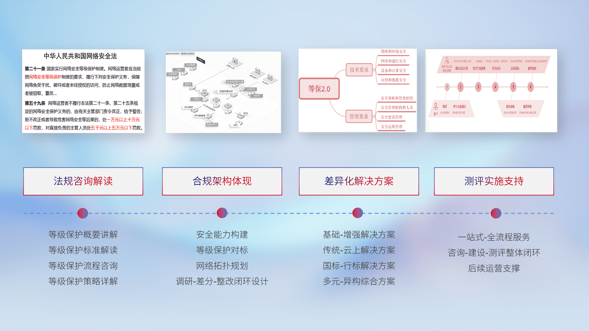 通过专业的法律咨询解读、、、合规架构体现、、差异化解决方案、、、测试实施支持等服务,,,为客户量身打造等保合规体系。。。。
